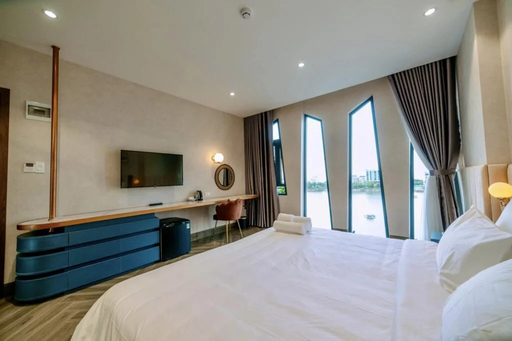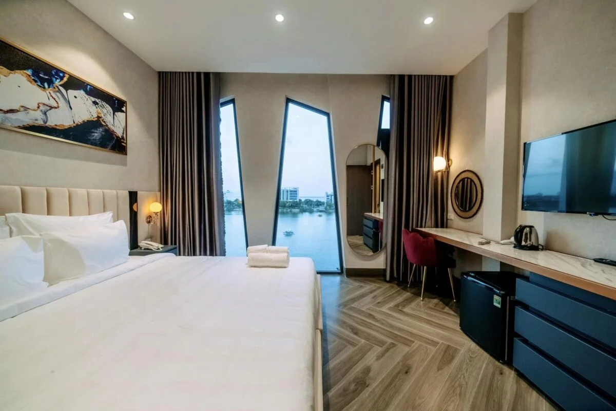 Phòng Deluxe với tầm nhìn sông tại La Beaute Hotel là một lựa chọn tuyệt vời cho các cặp đôi hoặc gia đình muốn tận hưởng không gian nghỉ dưỡng tuyệt. Với cửa sổ lớn và tầm nhìn đẹp ra sông, phòng Deluxe tạo ra một không gian thoải mái.