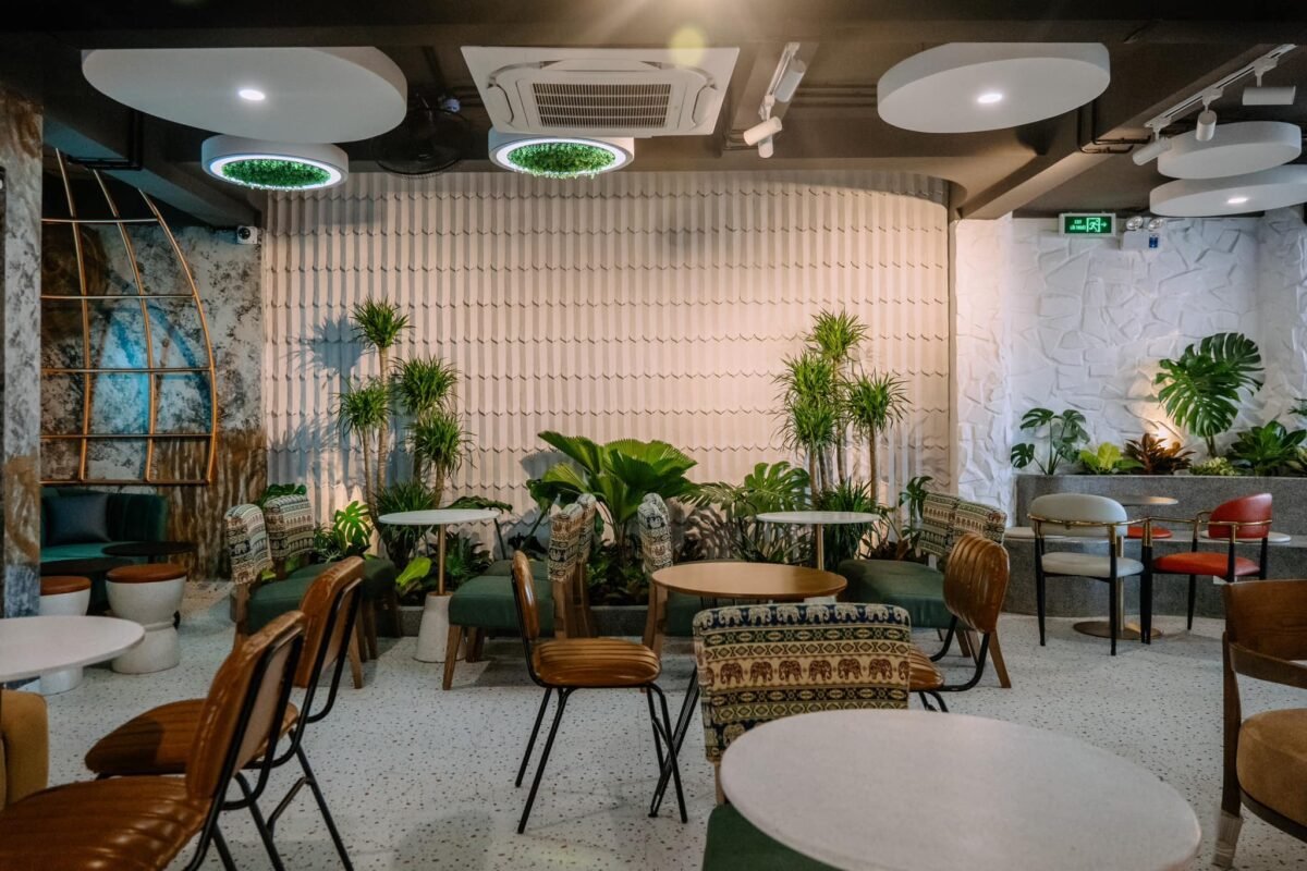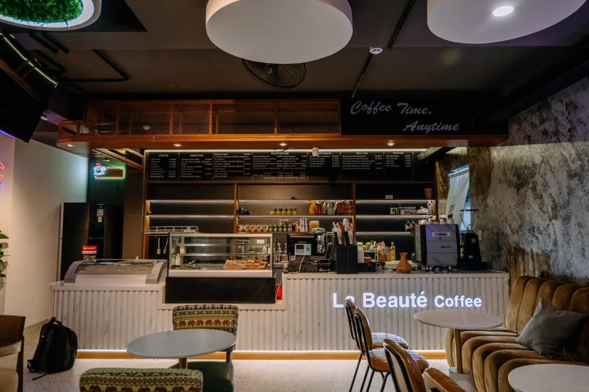 Sảnh và quán cà phê La Beauté được thiết kế hiện đại với không gian đầy đủ thoải mái và thoáng mát.